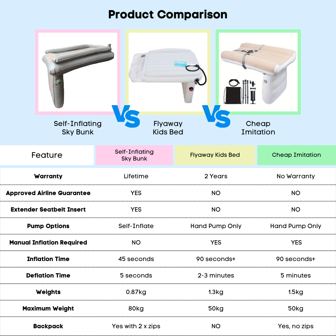 With unmatched innovation, thoughtful design, and a commitment to quality, the Self-Inflating Kooshy Kids Sky Bunk™ sets the standard for family travel comfort. Don’t settle for cheap imitations—choose the only brand offering a Lifetime Warranty and an Accepted Airline Money Back Guarantee for your family’s ultimate peace of mind.