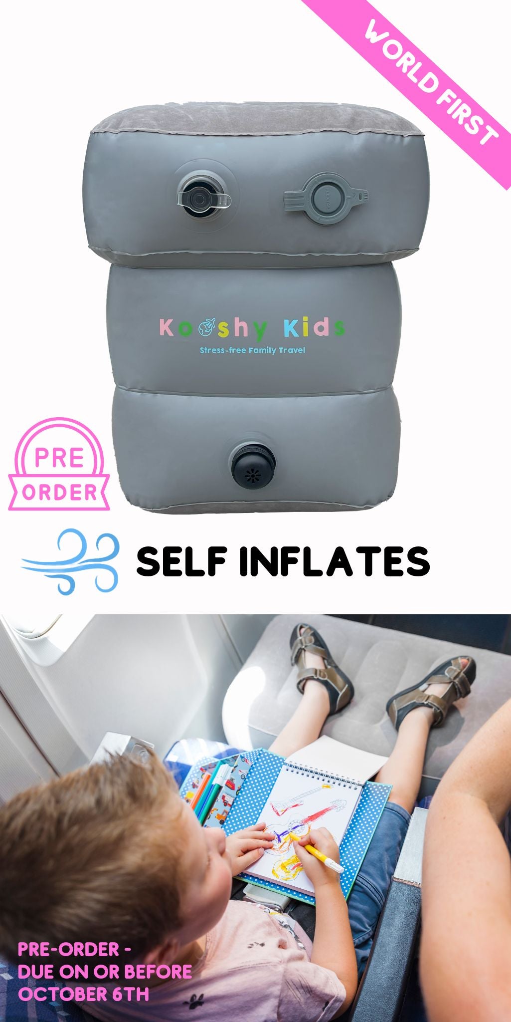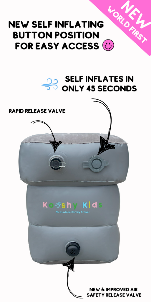 Meet the world’s NEWEST Self-Inflating Kooshy Kids Kooshion™—now powered by an exclusive next-generation pump developed by the world’s leading pump manufacturer, created solely for Kooshy Kids. With a sleeker design, twice the battery life, and whisper-quiet inflation, it’s the ultimate upgrade in family travel comfort.