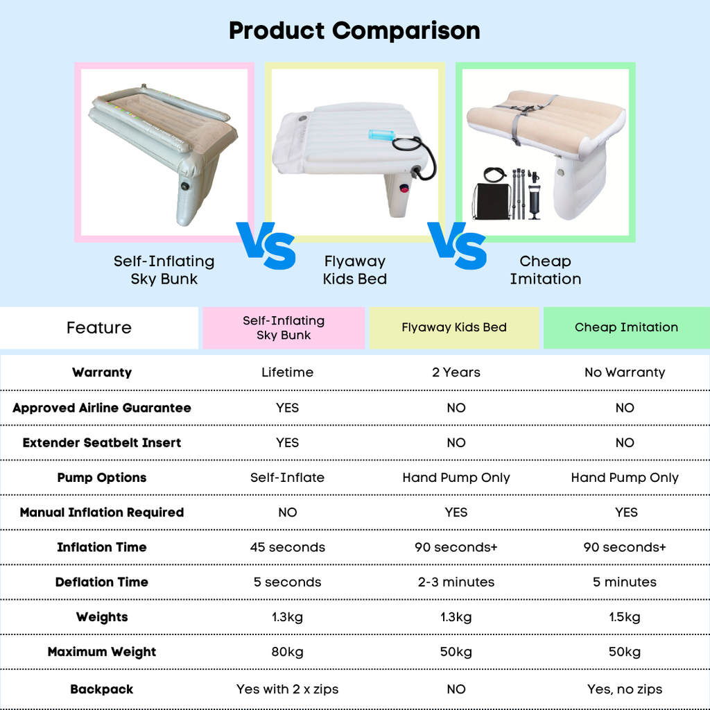 With unmatched innovation, thoughtful design, and a commitment to quality, the Self-Inflating Kooshy Kids Sky Bunk™ sets the standard for family travel comfort. Don’t settle for cheap imitations—choose the only brand offering a Lifetime Warranty and an Accepted Airline Money Back Guarantee for your family’s ultimate peace of mind.