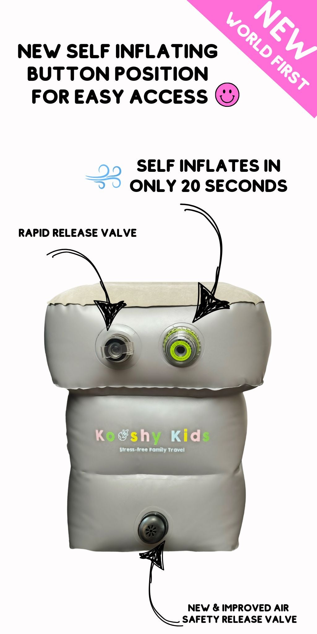 Meet the world-leading Self-Inflating Kooshy Kids Kooshion™ — designed to make travelling with kids easier, calmer, and more comfortable 💛